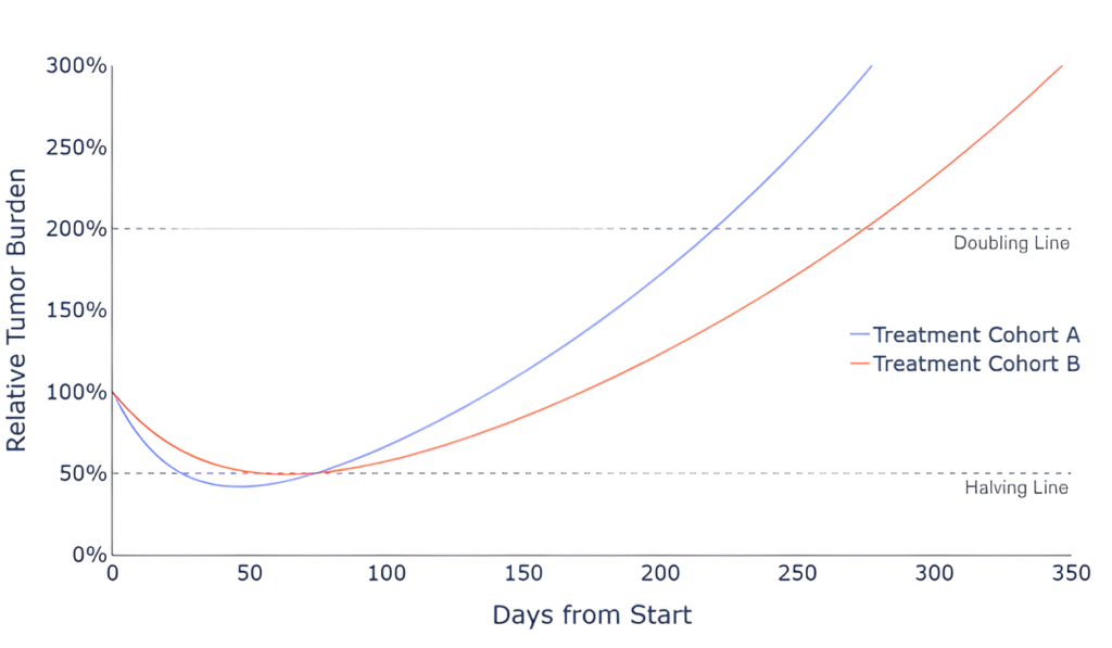 Additionally, these growth and decay constants can be averaged across treatment cohorts to generalize how groups are responding to treatment. In the figure above we notice that although the average patient in Treatment Cohort B is estimated to achieve halving time approximately 30 days later than the average patient of Treatment Cohort A, the average patient’s tumor burden in Treatment Cohort B doubles in size almost 50 days later. This implies that although Treatment A may be initially more effective, Treatment B displays better long-term suppression of cancerous growth.